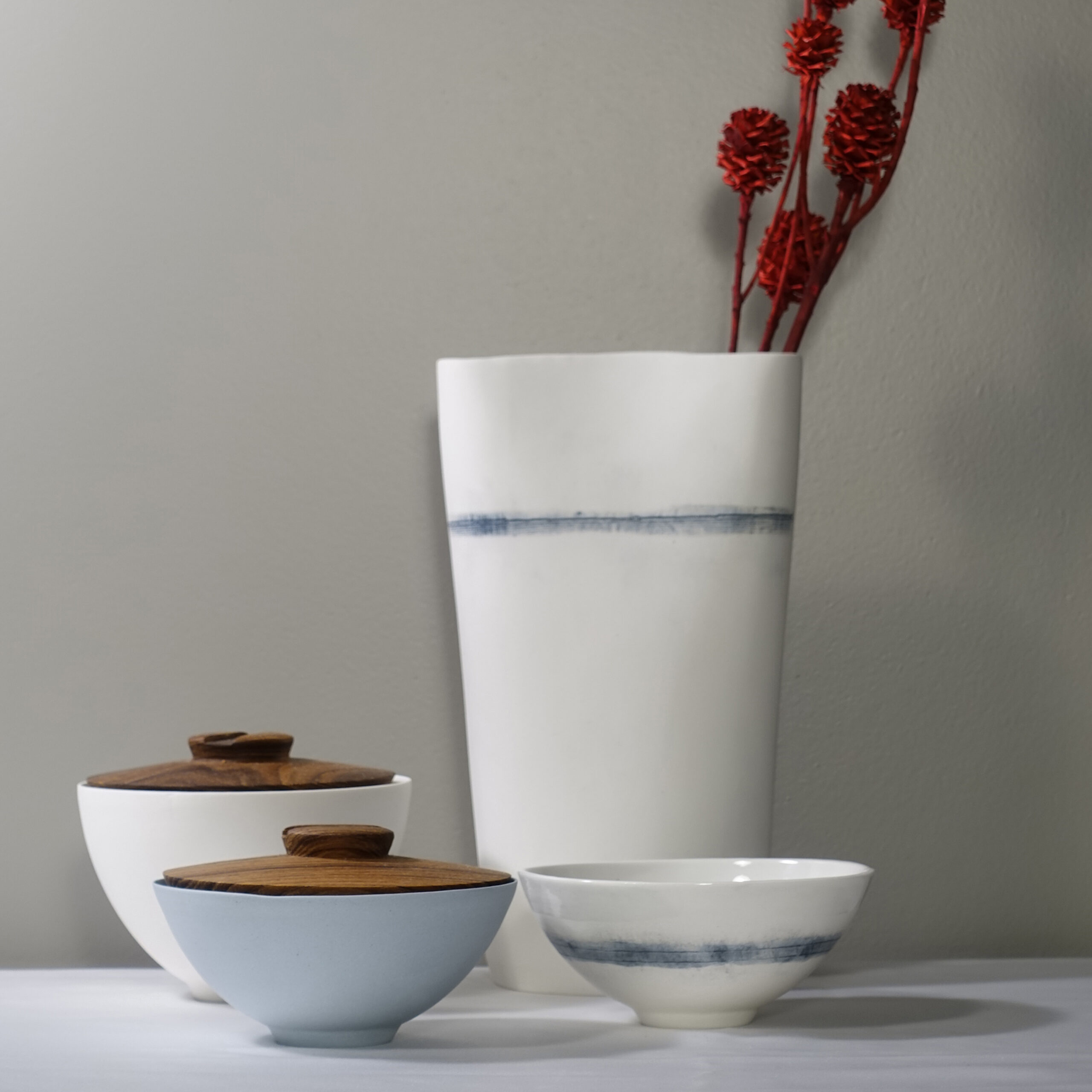 Nach eigenen Entwürfen und der Herstellung einer „sinnvollen“ Form entsteht zum Beispiel eine individuelle Teeschale, die das Teetrinken zum Genuss macht. Das Porzellan in seiner feinen Biskuit- Oberfläche sorgt zudem für ein haptisches Vergnügen. Die Farben entstehen durch das Arbeiten mit Farbkörpern, d.h. das Porzellan ist durch und durch eingefärbt. Mehr Handarbeit ist kaum möglich.